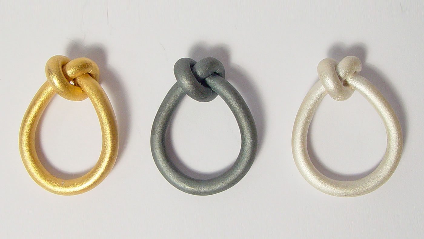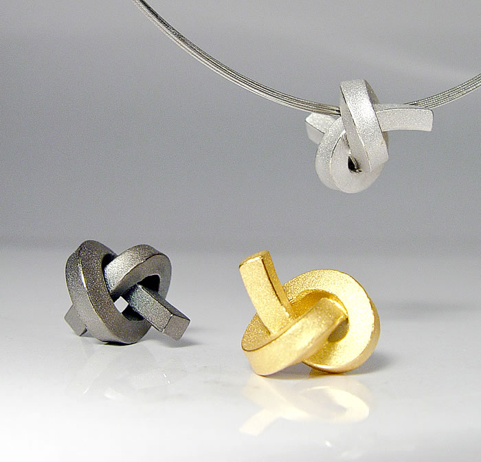 Knoten aus massivem 925er Silber stehen in den drei Oberflächenveredelungen hell rhodiniert, schwarz rutheniert oder stark goldplattiert zur Auswahl. Die massive Goldausführung wird in 585er Gelbgold angeboten. Auf Anfrage sind weitere Legierungen wie 750er Gelbgold oder 950er Platin erhältlich.